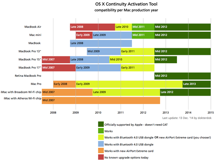 همانطور که در جریان هستید یک سری از قابلیتهای جدید و جذاب OS X Yosemite بر پایه بلوتوث و البته نسخه ۴ عمل میکند. قابلیتهایی مانند Handoff ،Instant Hotspot و Airdrop جدید (بین iOS و مک). بنابراین تقریبا میتوان گفت دستگاههایی که از سال ۲۰۱۲ به بعد عرضه شدهاند از این قابلیتها پشتیبانی میکنند و در دستگاههای قدیمیتر از این سرویسها خبری نیست. اما چندی پیش ابزار جدیدی منتشر شد بنام Continuity Activation Tool که در صورت ایجاد تغییراتی سخت افزاری در دستگاه خود مانند نصب دانگل بلوتوث ۴ و … میتوانید این قابلیتها را در دستگاههای قدیمیتر فعال کنید. لازم به ذکر است که در صورت تعویض چیپهای سخت افزاری یا حتی نصب دانگل بلوتوث نیز باز هم امکان استفاده از این قابلیتها نیست و تنها در صورت استفاده از این سرویس که تغییراتی در فایلهای سیستمی ایجاد میکند، میتوانید آنها را فعالی کنید.